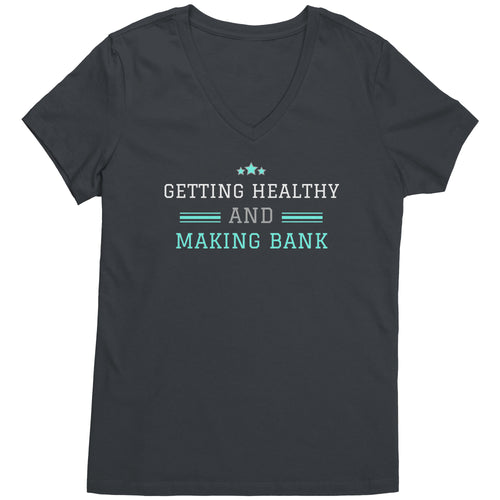 Partner.Co | Getting Healthy and Making Bank / Ask Me How lt green Woman logo| Women's V-Neck