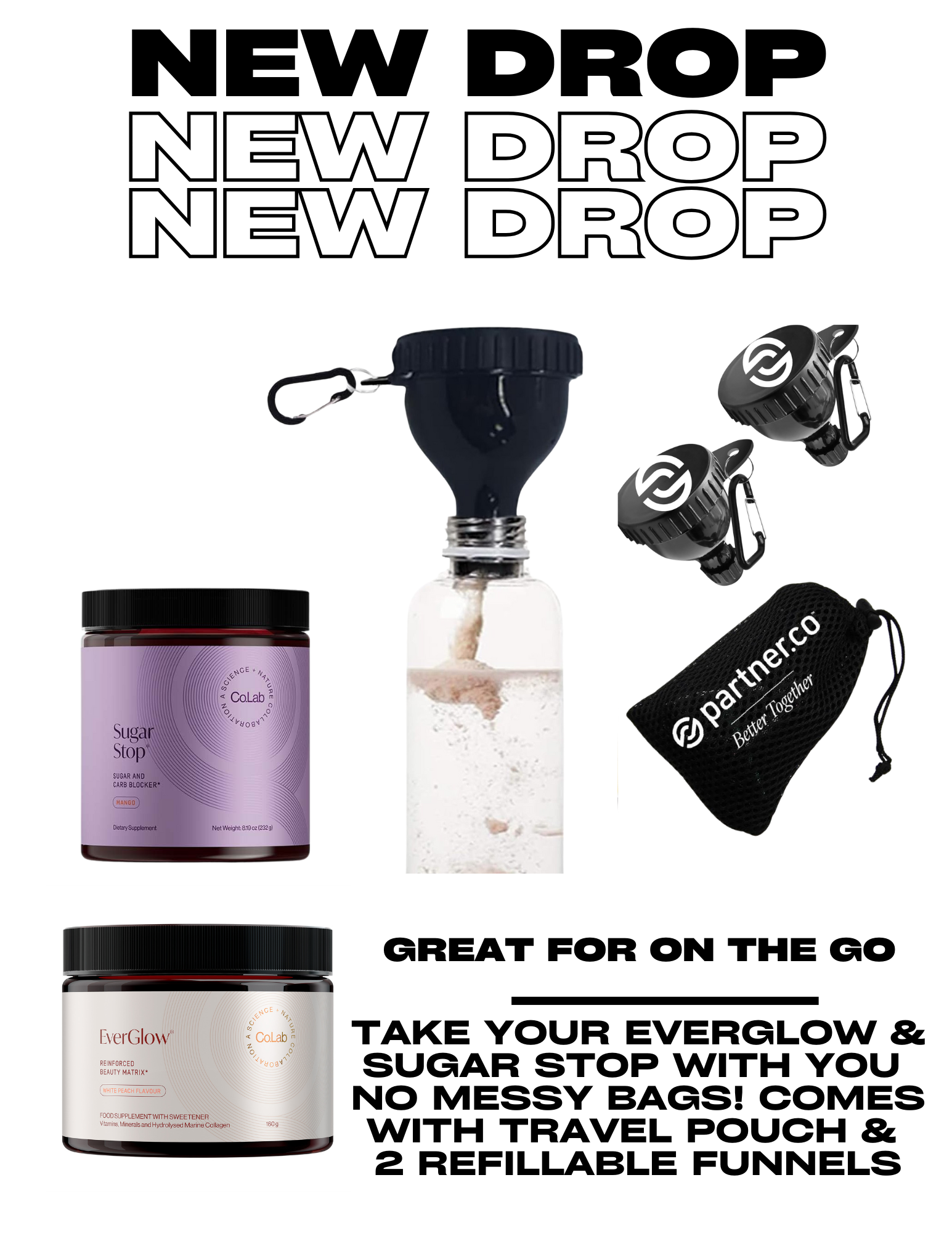Partner.Co | White Circle Logo| Sugar Stop One the Go Single Serve Reusable Funnel Kit